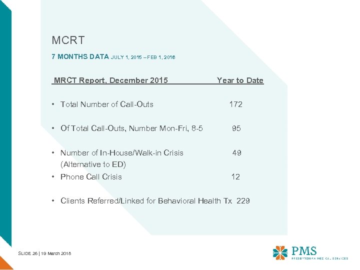MCRT 7 MONTHS DATA JULY 1, 2015 – FEB 1, 2016 MRCT Report, December 2015 Year to Date • Total Number of Call-Outs 172 • Of Total Call-Outs, Number Mon-Fri, 8 -5 95 • Number of In-House/Walk-in Crisis 49 (Alternative to ED) • Phone Call Crisis 12 • Clients Referred/Linked for Behavioral Health Tx 229 SLIDE 26 | 19 March 2018