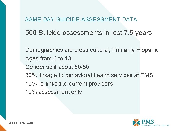 SAME DAY SUICIDE ASSESSMENT DATA 500 Suicide assessments in last 7. 5 years Demographics are cross cultural; Primarily Hispanic Ages from 6 to 18 Gender split about 50/50 80% linkage to behavioral health services at PMS 10% re-linked to current providers 10% assessment only SLIDE 8 | 19 March 2018