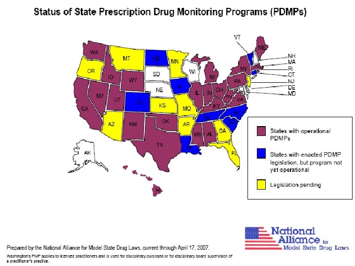 Prescription Monitoring Programs • State-instituted programs • Electronic access to history of prescribed (and filled) scheduled drugs – Required pharmacy data reporting • States vary – Reporting of Schedules (II or II-IV) – Response to inquiries: reactive or proactive • Safeguards for patient confidentiality www. deadiversion. usdoj. gov/faq/rx_monitor. h tm