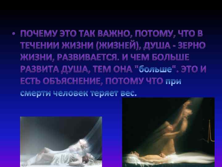 Но она материальна… Средняя душа, имеет вес от 2 до 4 граммов, но бывают люди, которых называют " "и у такого человека в тонком (невидимом) мире, она будет весить от 10 до 12 граммов.
