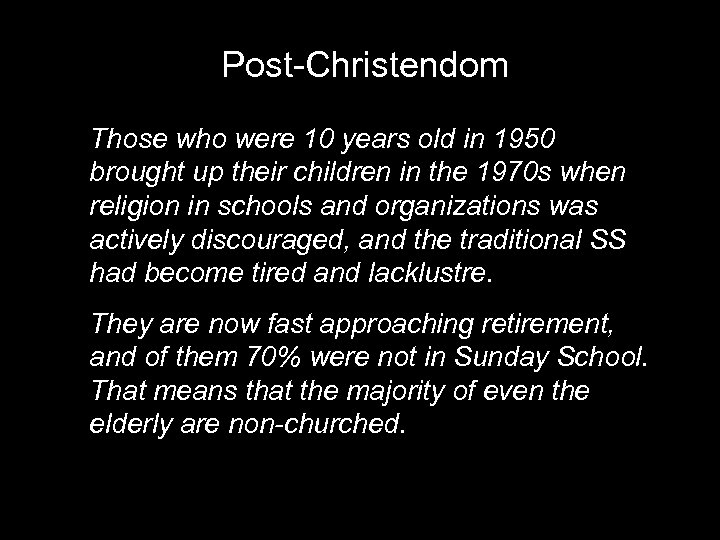 Post-Christendom Those who were 10 years old in 1950 brought up their children in the 1970 s when religion in schools and organizations was actively discouraged, and the traditional SS had become tired and lacklustre. They are now fast approaching retirement, and of them 70% were not in Sunday School. That means that the majority of even the elderly are non-churched.