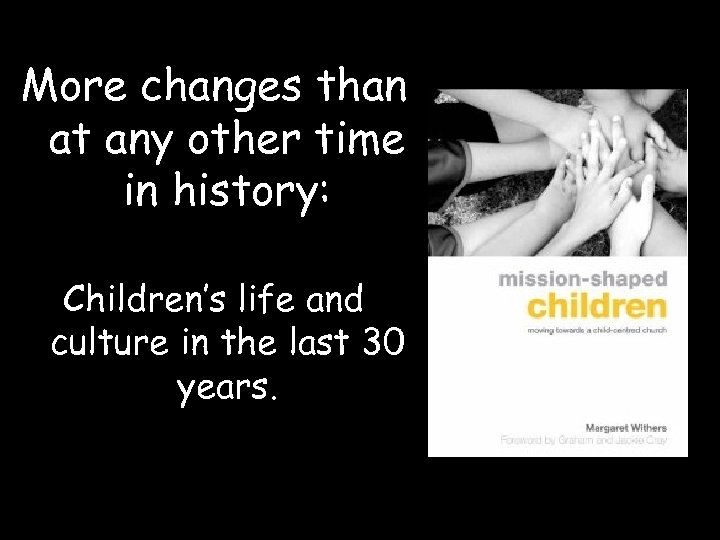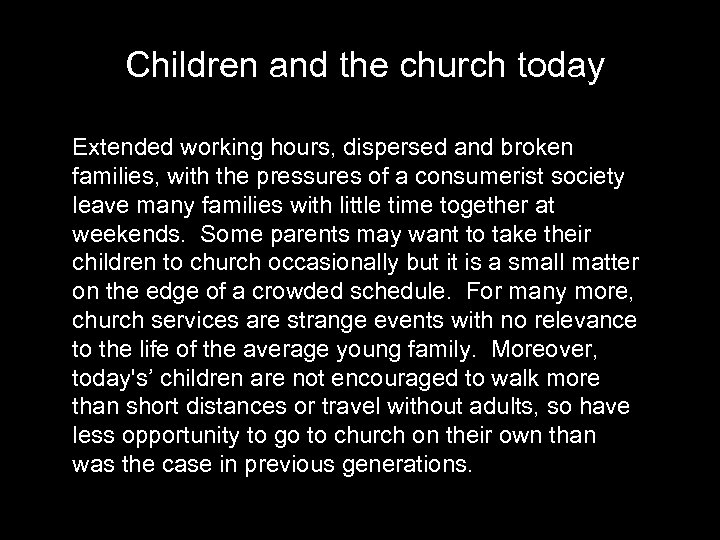 Children and the church today Extended working hours, dispersed and broken families, with the pressures of a consumerist society leave many families with little time together at weekends. Some parents may want to take their children to church occasionally but it is a small matter on the edge of a crowded schedule. For many more, church services are strange events with no relevance to the life of the average young family. Moreover, today's’ children are not encouraged to walk more than short distances or travel without adults, so have less opportunity to go to church on their own than was the case in previous generations.