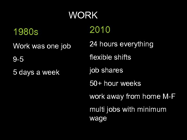 WORK 1980 s 2010 Work was one job 24 hours everything 9 -5 flexible shifts 5 days a week job shares 50+ hour weeks work away from home M-F multi jobs with minimum wage