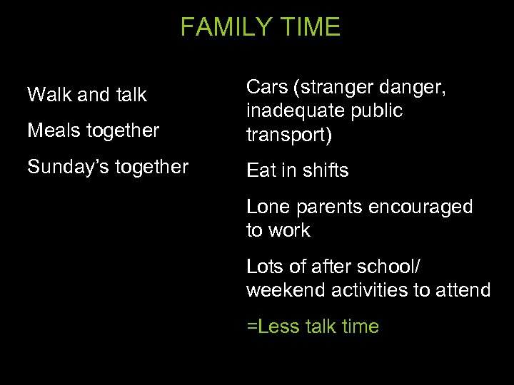 FAMILY TIME Meals together Cars (stranger danger, inadequate public transport) Sunday’s together Eat in shifts Walk and talk Lone parents encouraged to work Lots of after school/ weekend activities to attend =Less talk time