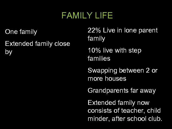 FAMILY LIFE One family Extended family close by 22% Live in lone parent family 10% live with step families Swapping between 2 or more houses Grandparents far away Extended family now consists of teacher, child minder, after school club.