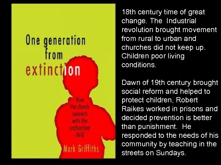 18 th century time of great change. The Industrial revolution brought movement from rural to urban and churches did not keep up. Children poor living conditions. Dawn of 19 th century brought social reform and helped to protect children, Robert Raikes worked in prisons and decided prevention is better than punishment. He responded to the needs of his community by teaching in the streets on Sundays.