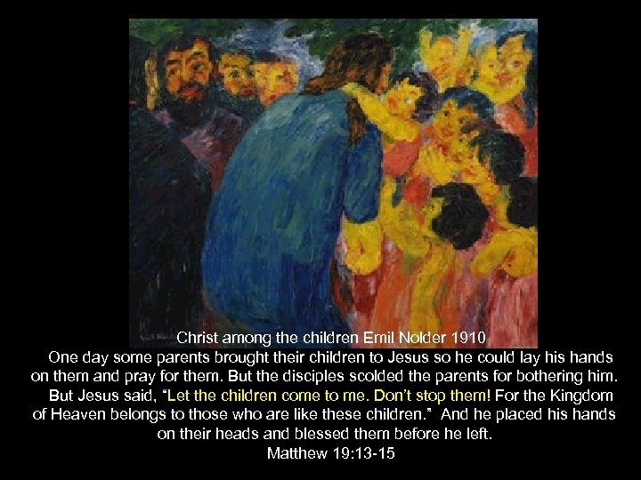 Christ among the children Emil Nolder 1910 One day some parents brought their children to Jesus so he could lay his hands on them and pray for them. But the disciples scolded the parents for bothering him. But Jesus said, “Let the children come to me. Don’t stop them! For the Kingdom of Heaven belongs to those who are like these children. ” And he placed his hands on their heads and blessed them before he left. Matthew 19: 13 -15