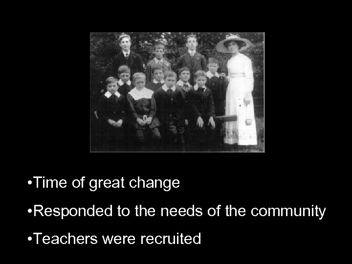 • Time of great change • Responded to the needs of the community • Teachers were recruited