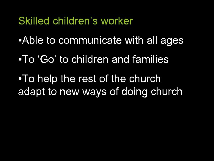 Skilled children’s worker • Able to communicate with all ages • To ‘Go’ to children and families • To help the rest of the church adapt to new ways of doing church