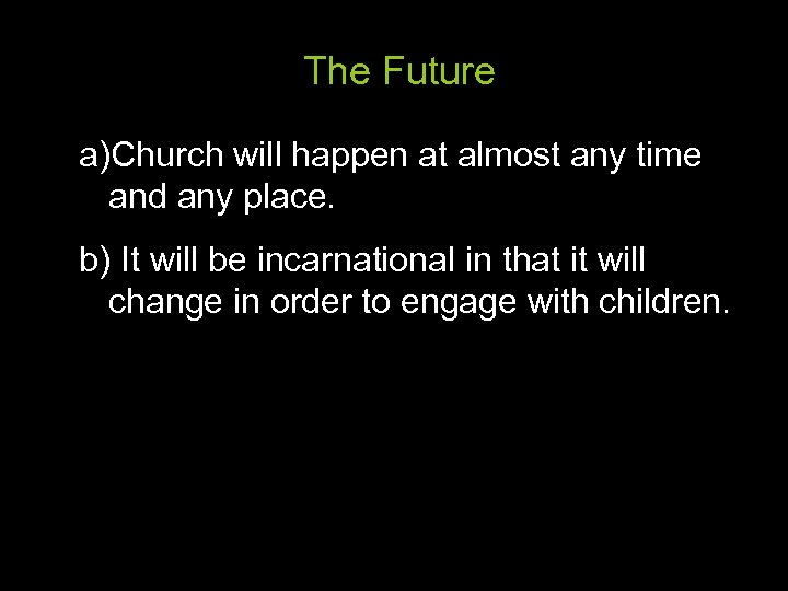 The Future a)Church will happen at almost any time and any place. b) It will be incarnational in that it will change in order to engage with children.