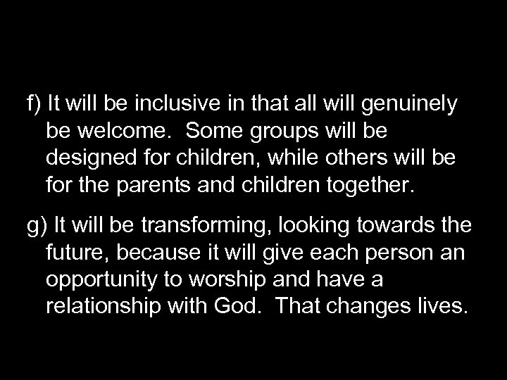f) It will be inclusive in that all will genuinely be welcome. Some groups will be designed for children, while others will be for the parents and children together. g) It will be transforming, looking towards the future, because it will give each person an opportunity to worship and have a relationship with God. That changes lives.