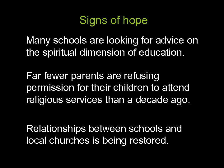 Signs of hope Many schools are looking for advice on the spiritual dimension of education. Far fewer parents are refusing permission for their children to attend religious services than a decade ago. Relationships between schools and local churches is being restored.