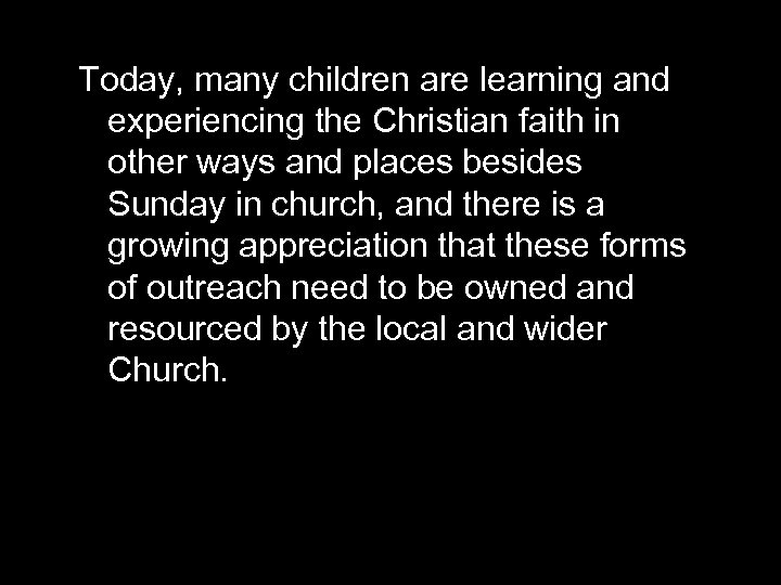 Today, many children are learning and experiencing the Christian faith in other ways and places besides Sunday in church, and there is a growing appreciation that these forms of outreach need to be owned and resourced by the local and wider Church.