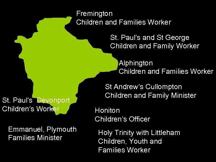 Fremington Children and Families Worker St. Paul’s and St George Children and Family Worker Alphington Children and Families Worker St. Paul’s Devonport Children’s Worker Emmanuel, Plymouth Families Minister St Andrew’s Cullompton Children and Family Minister Honiton Children’s Officer Holy Trinity with Littleham Children, Youth and Families Worker