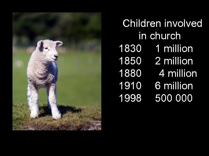 Children involved in church 1830 1 million 1850 2 million 1880 4 million 1910 6 million 1998 500 000