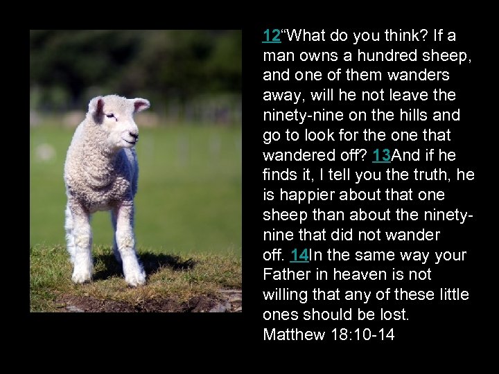 12“What do you think? If a man owns a hundred sheep, and one of them wanders away, will he not leave the ninety-nine on the hills and go to look for the one that wandered off? 13 And if he finds it, I tell you the truth, he is happier about that one sheep than about the ninetynine that did not wander off. 14 In the same way your Father in heaven is not willing that any of these little ones should be lost. Matthew 18: 10 -14