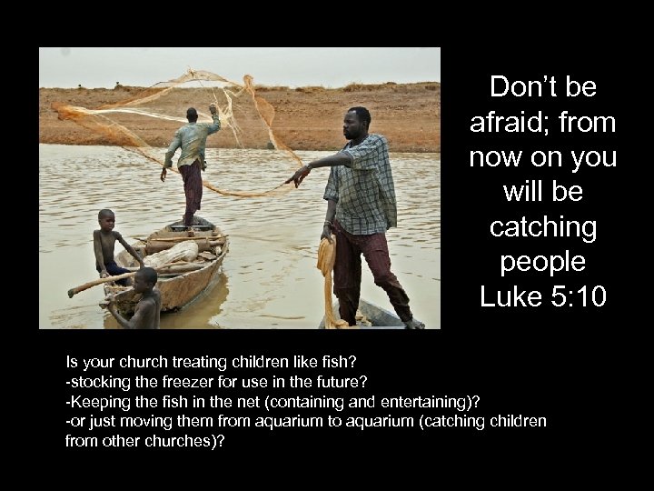 Don’t be afraid; from now on you will be catching people Luke 5: 10 Is your church treating children like fish? -stocking the freezer for use in the future? -Keeping the fish in the net (containing and entertaining)? -or just moving them from aquarium to aquarium (catching children from other churches)?