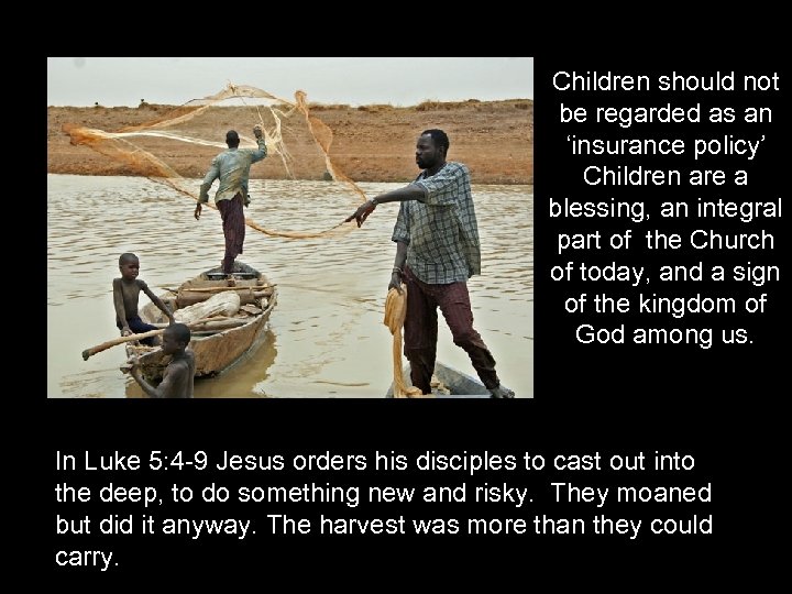 Children should not be regarded as an ‘insurance policy’ Children are a blessing, an integral part of the Church of today, and a sign of the kingdom of God among us. In Luke 5: 4 -9 Jesus orders his disciples to cast out into the deep, to do something new and risky. They moaned but did it anyway. The harvest was more than they could carry.