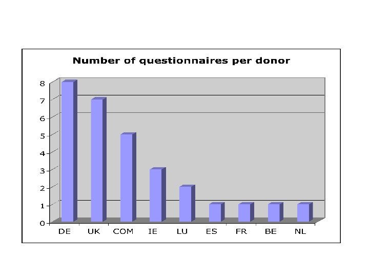 Two questionnaires for a bottom-up approach The EU questionnaire (EUQ) sent The Sub Saharan Africa Questionnaire (SSAQ) circulated to African stakeholders and experts in social protection (government, civil society, academia, international institutions etc) Five sections – open and closeended questions How: Questionnaire sent to participants by e-mail Snowball sampling: interviewed persons were asked to nominate other experts to create a network: i) Networking ii) New ideas iii) Updated information iii) Dissemination Total date respondents: 50 to to EU practitioners managing their donors’ social protection portfolio in the field Who: EC, GDC, DFID circulated the questionnaire to their representatives. As for BE, ES, IE, LU, NL we contacted the people in the field directly. Practitioners from 9 EU donors (COM, Germany, UK, Ireland, Luxembourg, France, Spain, Belgium, The Netherlands) have participated in the initiative. Where: The questionnaires cover 11 SSA countries (Burkina Faso, DRC, Ethiopia, Ghana, Kenya, Lesotho, Mozambique, Rwanda, Senegal, Tanzania, Zambia) as well as 6 non-SSA (Afghanistan, Cambodia, Indonesia, Nepal, Vietnam).