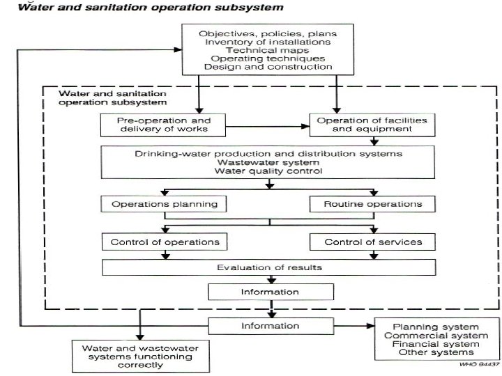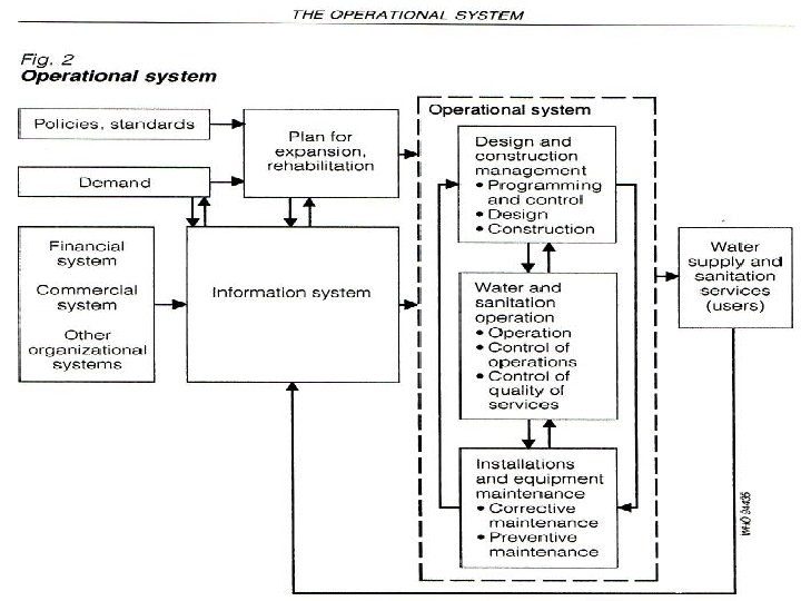 OPERATION SYSTEM The Objectives of the Operation Systems are • To supply plans and designs for the construction work necessary for provision of the agency a services, in line with technical, social and financial requirements • To ensure that construction work complies with the plans and designs of the agency and is appropriate to the needs of the community with regard to health, quality, functioning, timing and cost. • To establish standards for the delivery of services that are satisfactory in respect of quality, quantity, continuity, coverage and cost; • To maintain the installations and equipment in a condition that will ensure they can be operated satisfactorily, function efficiently and continuously and last as long as possible at lowest cost; • To produce information on the water supply and sanitation installations and their component units, with specific reference to their functioning and their adequacy to meet the needs of users, thus enabling the agency to evaluate how well the installations work and how effective its services are