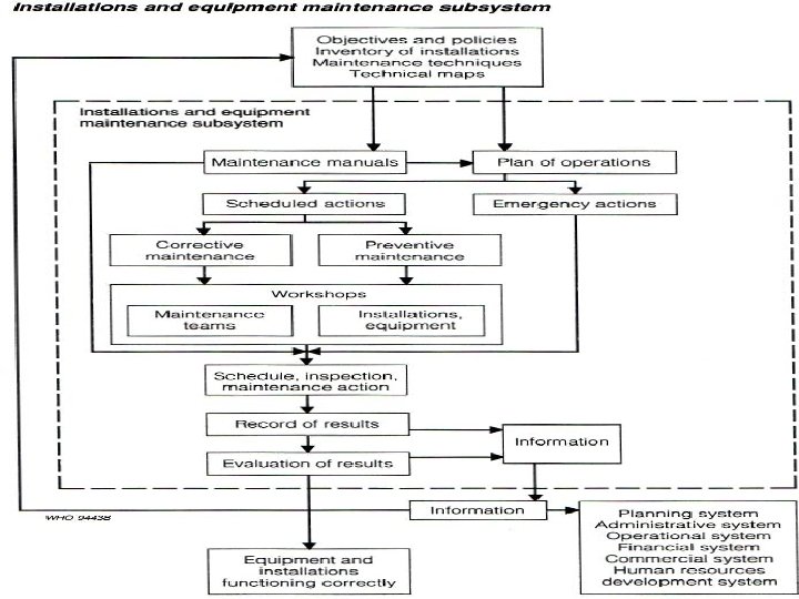 OPERATION SYSTEM In carrying out preventive and corrective maintenance, the subsystem’s activities – whether managerial or operational fulfill the following tasks • Actions are performed on the components and equipment of the agency’s installations to ensure their cost effective operation • Maintenance work performed on the installations and equipment is monitored for quality and timeliness • Maintenance is controlled and monitored in order to measure the performance of equipment and installations, estimate their useful life and provide for their replacement when indicated by cost benefit studies or other technical considerations. • Reliable, adequate and up-to-date information is collected, recorded and processed for the planning and proper execution of preventive and corrective maintenance activities