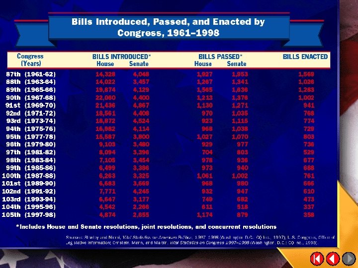 The Line-Item Veto • For many years governors had the power to veto selected items in a bill. This is sometimes called a line-item veto. • The president, on the other hand, had to accept or reject the whole bill. • In 1996 Congress passed legislation that permitted the president to veto spending items and certain limited tax breaks. • The Supreme Court ruled this legislation unconstitutional in 1998. Click the mouse button or press the Space Bar to display the information.