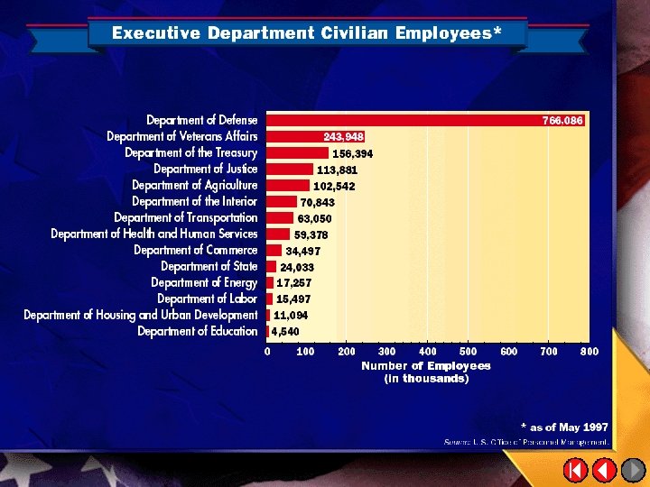 Chief Executive • As the nation’s chief executive, the president sees that the laws of Congress are carried out. • The executive branch employs more than 2 million people to enforce the many laws and programs Congress establishes. • The president is in charge of these employees and the federal departments and agencies for which they work. Click the mouse button or press the Space Bar to display the information.