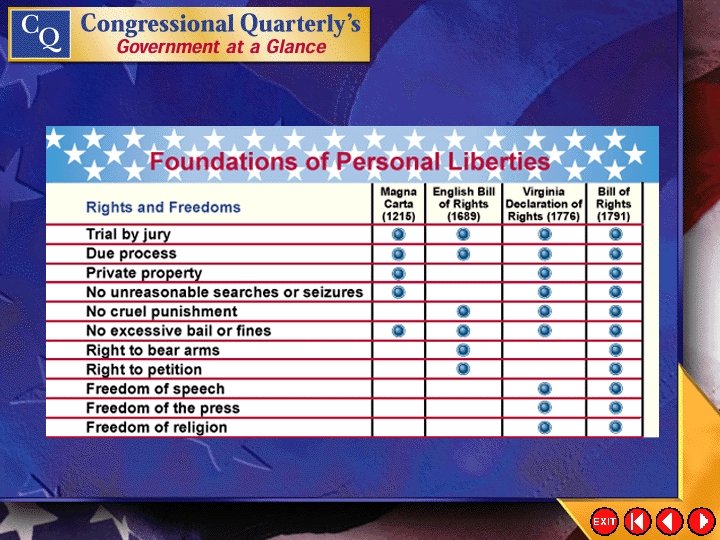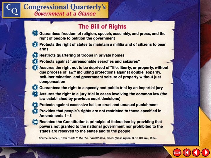 The Bill of Rights • The Bill of Rights limits the powers of government by protecting the rights of individual liberty. • Although the Bill of Rights originally applied only to the national government, almost all its provisions have been applied to the states. Click the mouse button or press the Space Bar to display the information.