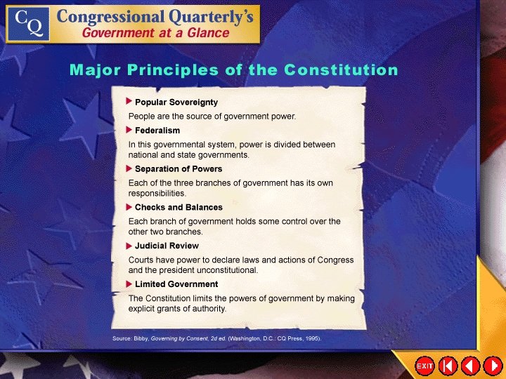 Major Principles • The Constitution rests on six major principles of government: – popular sovereignty – federalism – separation of powers – checks and balances – judicial review – limited government Click the mouse button or press the Space Bar to display the information.