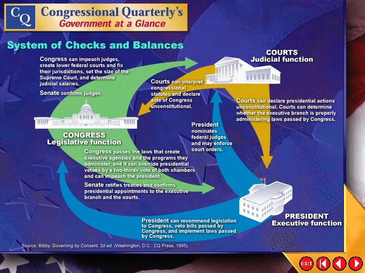 Checks and Balances • To the principle of separation of powers the Founders added a system of checks and balances, whereby each branch of government exercises some control over the others. • For example, Congress passes laws. The president can veto, or reject, those laws. Click the mouse button or press the Space Bar to display the information.