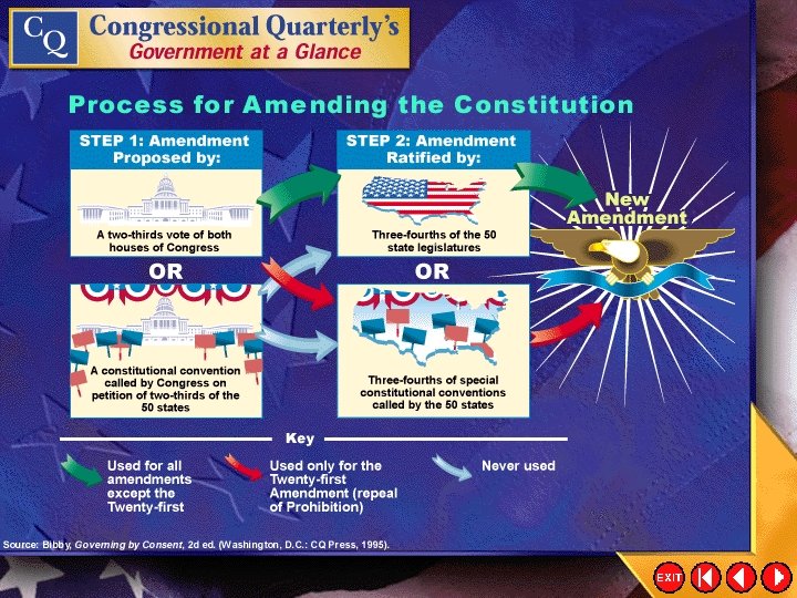 Ratifying Amendments (cont. ) • A question arises when a state legislature approves an amendment and then revokes the ratification. Is this legal? • The Equal Rights Amendment (ERA) would have prohibited discrimination on the basis of gender. • When 5 of the 35 states that approved the ERA later revoked their ratification, many constitutional scholars contended that the revocations were unconstitutional. • The courts, however, never resolved the issue. Click the mouse button or press the Space Bar to display the information.