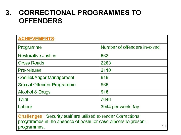 3. CORRECTIONAL PROGRAMMES TO OFFENDERS ACHIEVEMENTS: Programme Number of offenders involved Restorative Justice 862 Cross Roads 2263 Pre-release 2118 Conflict/Anger Management 919 Sexual Offender Programme 566 Alcohol & Drugs 918 Total 7646 Labour 3944 per week day Challenges: Security staff are utilised to render Correctional programmes in the absence of posts for case officers to present programmes. 13