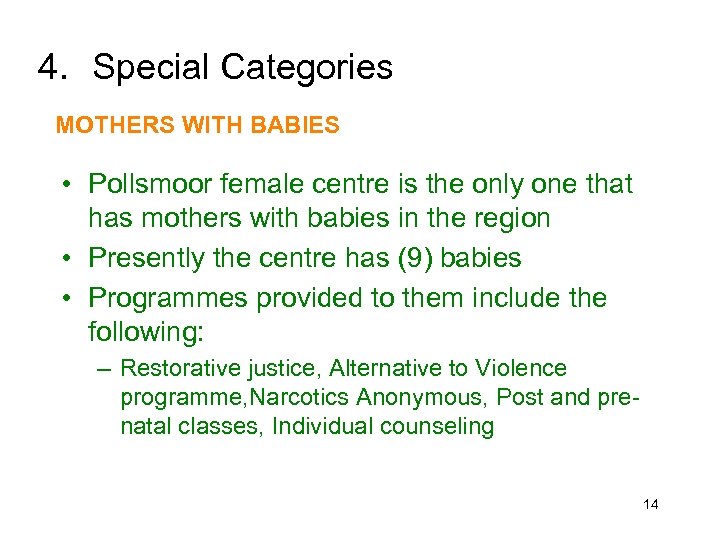 4. Special Categories MOTHERS WITH BABIES • Pollsmoor female centre is the only one that has mothers with babies in the region • Presently the centre has (9) babies • Programmes provided to them include the following: – Restorative justice, Alternative to Violence programme, Narcotics Anonymous, Post and prenatal classes, Individual counseling 14