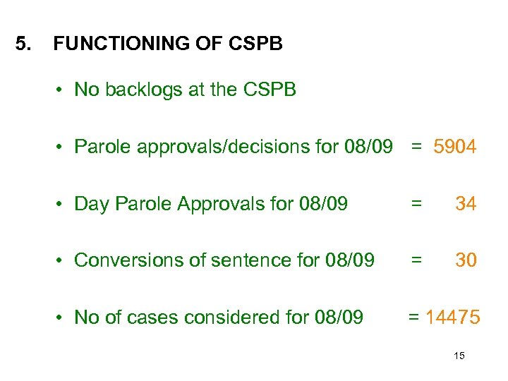 5. FUNCTIONING OF CSPB • No backlogs at the CSPB • Parole approvals/decisions for 08/09 = 5904 • Day Parole Approvals for 08/09 = 34 • Conversions of sentence for 08/09 = 30 • No of cases considered for 08/09 = 14475 15