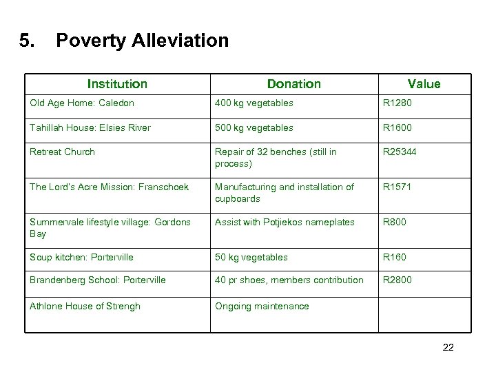 5. Poverty Alleviation Institution Donation Value Old Age Home: Caledon 400 kg vegetables R 1280 Tahillah House: Elsies River 500 kg vegetables R 1600 Retreat Church Repair of 32 benches (still in process) R 25344 The Lord’s Acre Mission: Franschoek Manufacturing and installation of cupboards R 1571 Summervale lifestyle village: Gordons Bay Assist with Potjiekos nameplates R 800 Soup kitchen: Porterville 50 kg vegetables R 160 Brandenberg School: Porterville 40 pr shoes, members contribution R 2800 Athlone House of Strengh Ongoing maintenance 22