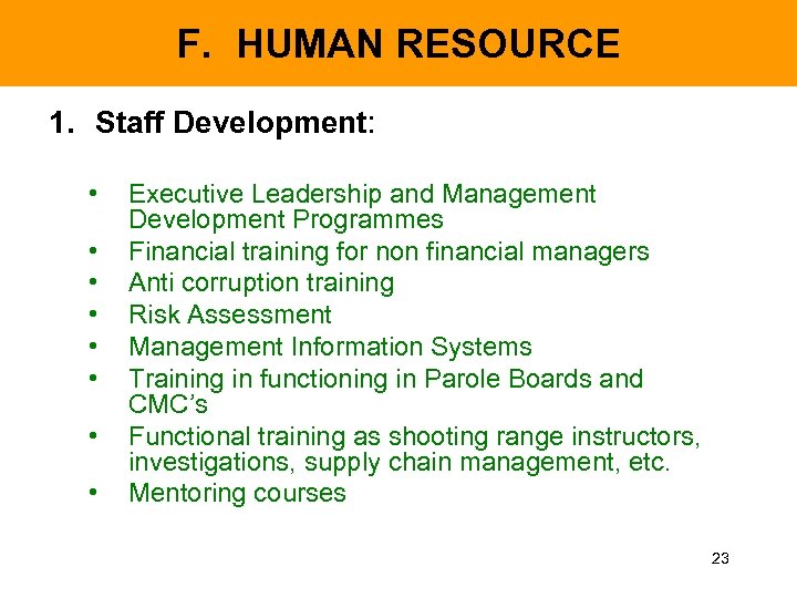 F. HUMAN RESOURCE 1. Staff Development: • • Executive Leadership and Management Development Programmes Financial training for non financial managers Anti corruption training Risk Assessment Management Information Systems Training in functioning in Parole Boards and CMC’s Functional training as shooting range instructors, investigations, supply chain management, etc. Mentoring courses 23