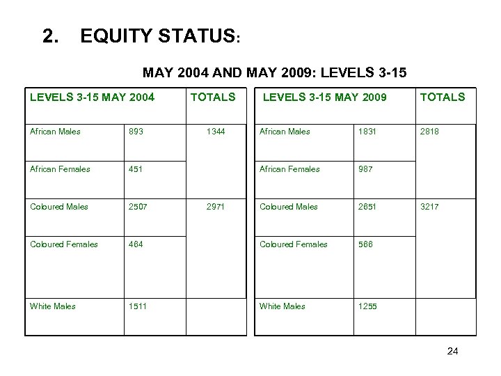 2. EQUITY STATUS: MAY 2004 AND MAY 2009: LEVELS 3 -15 MAY 2004 African Males 893 African Females 451 Coloured Males 2507 Coloured Females White Males TOTALS 1344 LEVELS 3 -15 MAY 2009 African Males 1831 African Females 987 Coloured Males 2651 464 Coloured Females 566 1511 White Males TOTALS 1255 2971 2818 3217 24