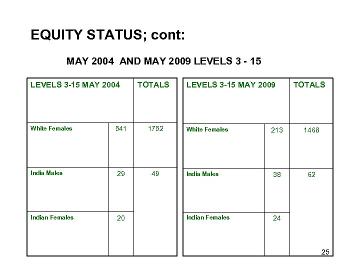 EQUITY STATUS; cont: MAY 2004 AND MAY 2009 LEVELS 3 - 15 LEVELS 3 -15 MAY 2004 White Females TOTALS 541 1752 India Males 29 49 Indian Females 20 LEVELS 3 -15 MAY 2009 White Females TOTALS 213 1468 India Males 38 62 Indian Females 24 25