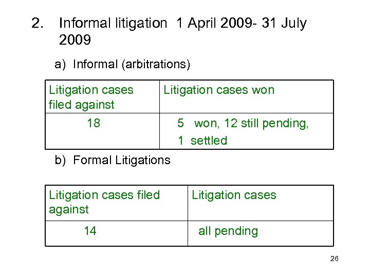 2. Informal litigation 1 April 2009 - 31 July 2009 a) Informal (arbitrations) Litigation cases filed against Litigation cases won 18 5 won, 12 still pending, 1 settled b) Formal Litigations Litigation cases filed against 14 Litigation cases all pending 26