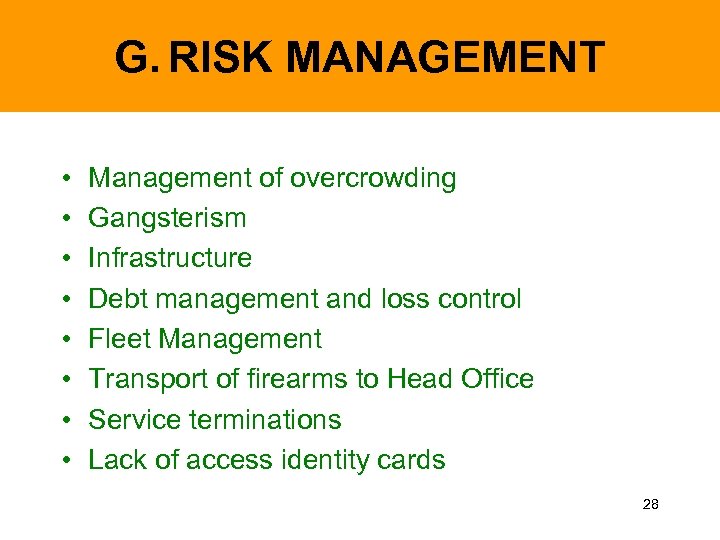 G. RISK MANAGEMENT • • Management of overcrowding Gangsterism Infrastructure Debt management and loss control Fleet Management Transport of firearms to Head Office Service terminations Lack of access identity cards 28