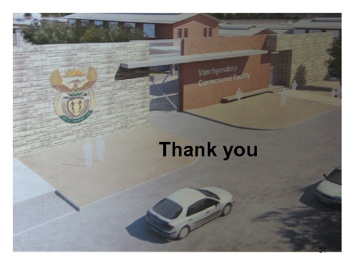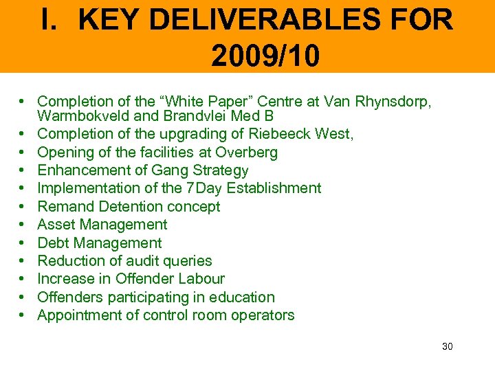 I. KEY DELIVERABLES FOR 2009/10 • Completion of the “White Paper” Centre at Van Rhynsdorp, Warmbokveld and Brandvlei Med B • Completion of the upgrading of Riebeeck West, • Opening of the facilities at Overberg • Enhancement of Gang Strategy • Implementation of the 7 Day Establishment • Remand Detention concept • Asset Management • Debt Management • Reduction of audit queries • Increase in Offender Labour • Offenders participating in education • Appointment of control room operators 30