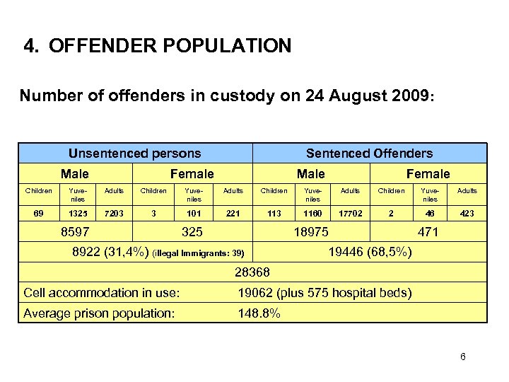 4. OFFENDER POPULATION Number of offenders in custody on 24 August 2009: Unsentenced persons Male Sentenced Offenders Female Male Female Children Yuveniles Adults 69 1325 7203 3 101 221 113 1160 17702 2 46 423 8597 325 18975 8922 (31, 4%) (illegal Immigrants: 39) 471 19446 (68, 5%) 28368 Cell accommodation in use: 19062 (plus 575 hospital beds) Average prison population: 148. 8% 6