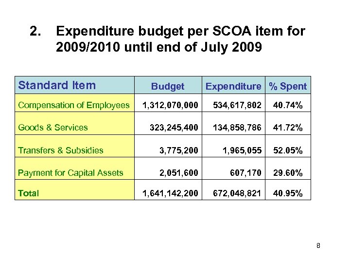 2. Expenditure budget per SCOA item for 2009/2010 until end of July 2009 Standard Item Compensation of Employees Budget Expenditure % Spent 1, 312, 070, 000 534, 617, 802 40. 74% 323, 245, 400 134, 858, 786 41. 72% Transfers & Subsidies 3, 775, 200 1, 965, 055 52. 05% Payment for Capital Assets 2, 051, 600 607, 170 29. 60% 1, 641, 142, 200 672, 048, 821 40. 95% Goods & Services Total 8