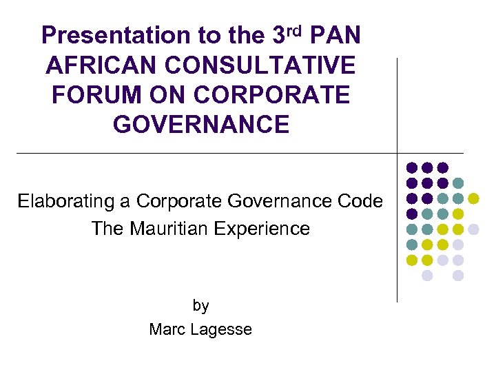 Presentation to the 3 rd PAN AFRICAN CONSULTATIVE FORUM ON CORPORATE GOVERNANCE Elaborating a Corporate Governance Code The Mauritian Experience by Marc Lagesse