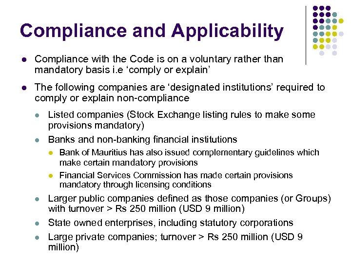 Compliance and Applicability l Compliance with the Code is on a voluntary rather than mandatory basis i. e ‘comply or explain’ l The following companies are ‘designated institutions’ required to comply or explain non-compliance l l Listed companies (Stock Exchange listing rules to make some provisions mandatory) Banks and non-banking financial institutions l l l Bank of Mauritius has also issued complementary guidelines which make certain mandatory provisions Financial Services Commission has made certain provisions mandatory through licensing conditions Larger public companies defined as those companies (or Groups) with turnover > Rs 250 million (USD 9 million) State owned enterprises, including statutory corporations Large private companies; turnover > Rs 250 million (USD 9 million)