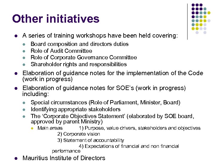 Other initiatives l A series of training workshops have been held covering: l l l Board composition and directors duties Role of Audit Committee Role of Corporate Governance Committee Shareholder rights and responsibilities Elaboration of guidance notes for the implementation of the Code (work in progress) Elaboration of guidance notes for SOE’s (work in progress) including: l l l Special circumstances (Role of Parliament, Minister, Board) Identifying appropriate stakeholders The ‘Corporate Objectives Statement’ (elaborated by SOE board, approved by parent Ministry) l l Main areas 1) Purpose, value drivers, stakeholders and objectives 2) Corporate vision 3) Statement of accountability 4) Expectations of financial and non financial performance Mauritius Institute of Directors