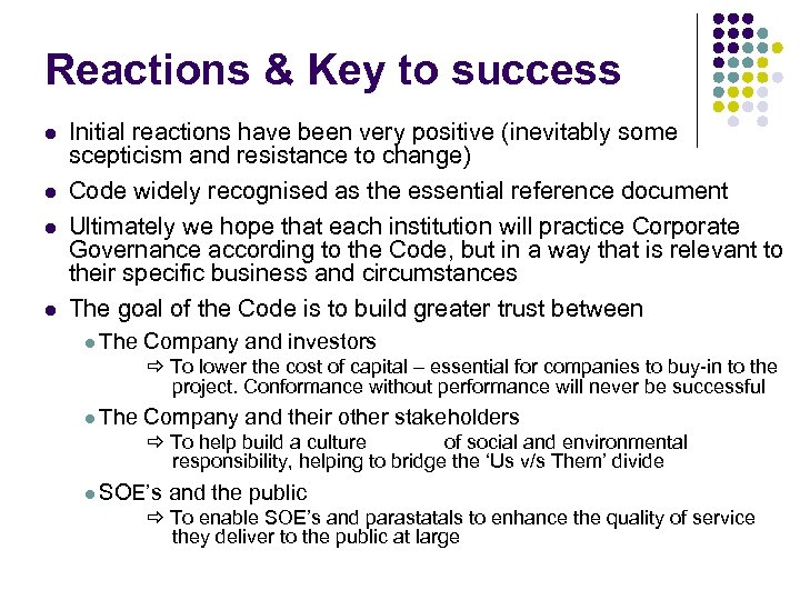 Reactions & Key to success l l Initial reactions have been very positive (inevitably some scepticism and resistance to change) Code widely recognised as the essential reference document Ultimately we hope that each institution will practice Corporate Governance according to the Code, but in a way that is relevant to their specific business and circumstances The goal of the Code is to build greater trust between l The Company and investors To lower the cost of capital – essential for companies to buy-in to the project. Conformance without performance will never be successful l The Company and their other stakeholders To help build a culture of social and environmental responsibility, helping to bridge the ‘Us v/s Them’ divide l SOE’s and the public To enable SOE’s and parastatals to enhance the quality of service they deliver to the public at large