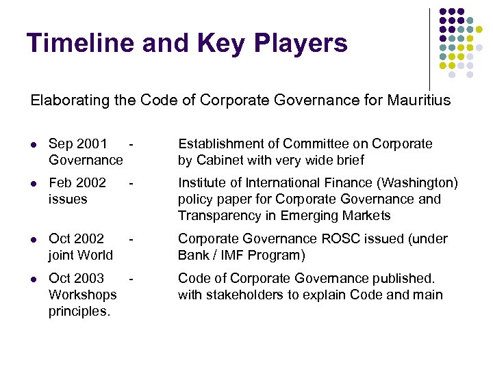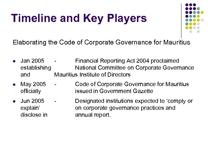 Timeline and Key Players Elaborating the Code of Corporate Governance for Mauritius l Jan 2005 Financial Reporting Act 2004 proclaimed establishing National Committee on Corporate Governance and Mauritius Institute of Directors l May 2005 officially - Code of Corporate Governance for Mauritius issued in Government Gazette l Jun 2005 explain’ disclose in - Designated institutions expected to ‘comply or on corporate governance practices and annual report.