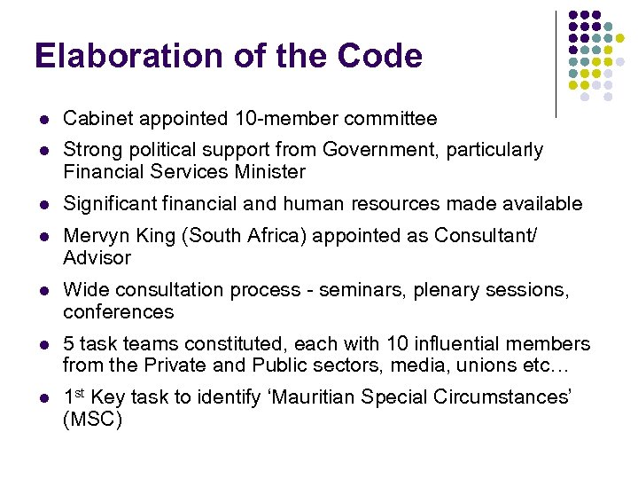 Elaboration of the Code l Cabinet appointed 10 -member committee l Strong political support from Government, particularly Financial Services Minister l Significant financial and human resources made available l Mervyn King (South Africa) appointed as Consultant/ Advisor l Wide consultation process - seminars, plenary sessions, conferences l 5 task teams constituted, each with 10 influential members from the Private and Public sectors, media, unions etc… l 1 st Key task to identify ‘Mauritian Special Circumstances’ (MSC)