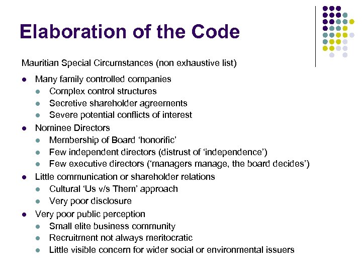 Elaboration of the Code Mauritian Special Circumstances (non exhaustive list) l l Many family controlled companies l Complex control structures l Secretive shareholder agreements l Severe potential conflicts of interest Nominee Directors l Membership of Board ‘honorific’ l Few independent directors (distrust of ‘independence’) l Few executive directors (‘managers manage, the board decides’) Little communication or shareholder relations l Cultural ‘Us v/s Them’ approach l Very poor disclosure Very poor public perception l Small elite business community l Recruitment not always meritocratic l Little visible concern for wider social or environmental issuers